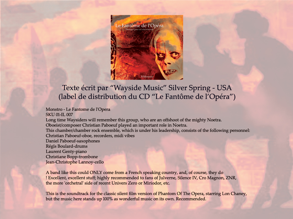 « Ce Fantôme de l’opéra est une relecture inventive du scénario de Julian, par une écrite contrapuntique jouant sur les combinaisons de timbres originaux et d’ostinatos mélodico-rythmiques avec des séquences d’improvisations libres.Tout en contrastes, accidents et ruptures plus ou moins annoncées, la musique de Christian Paboeuf, interprétée par Il Monstro, explore littéralement la progression dramatique du film et en fournit paradoxalement plus qu’une simple illustration, faisant du prétexte un laboratoire fantastique où la voix singulière de chacun s’inscrit dans une exploration collective guidée par un sens aigu de la narration. »